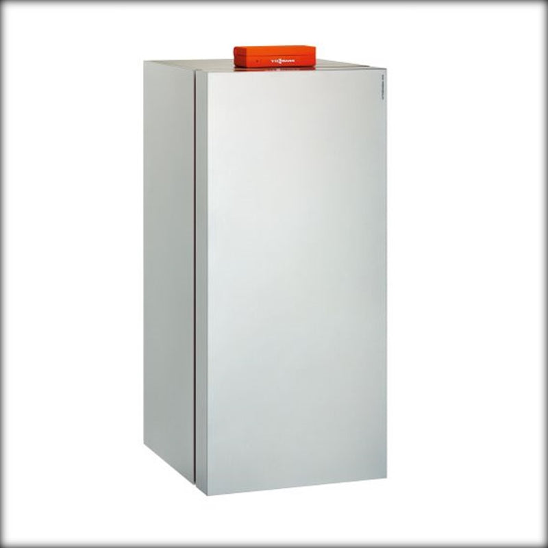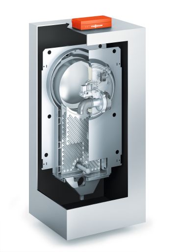 Boiler with vertically arranged Inox-Crossal heating surfaces made of stainless steel, for continuously lowered boiler water temperature. Suitable for room air dependent and room air independent operation. Extremely low pollutant emissions thanks to the modulating MatriX gas burner. Large water content for low cycles and direct connection of large heating circuits. Boiler body thermally insulated on all sides with highly effective compound thermal insulation. Easy and time-saving assembly of the boiler cladding without special tools with the Fastfix assembly system. Boiler cladding made of sheet steel, coated with epoxy resin, color vito silver.