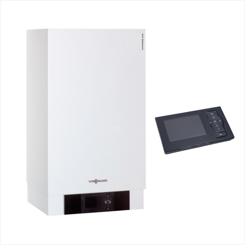 Mit digitaler Kesselkreisregelung Vitotronic 100 (Typ HC1B) für angehobene Kesselwassertemperatur und einen Heizkreis, mit Trinkwassertemperaturregelung und integriertem Diagnosesystem. Anschluss für externe Betriebsprogrammumschaltung mit Wirkung auf den Heizkreis, externe Anforderung, externes Sperren und Vorgabe der Kesselwasser-Solltemperatur über externes 0-10 V- Signal (mit Erweiterung, Zubehör) möglich. Die Regelung enthält: Anlagenschalter, Temperaturbegrenzer, Temperaturwächter, elektronischen Maximaltemperaturbegrenzer, Pumpenblockierschutz, Anzeige Brennerbetrieb und -störung, Entriegelung Brennerstörung, Anzeigefenster und Optolink Laptop-Schnittstelle, Einstellungen der Kesselwasser- und Trinkwassertemperatur, Temperatur- und Betriebszustandsabfrage sowie Schornsteinfegerprüfung.